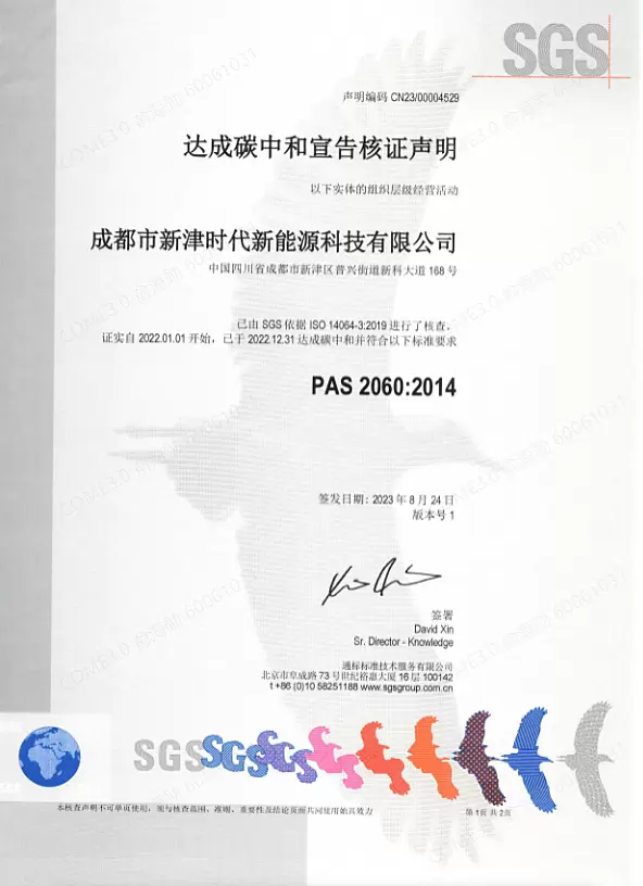 近日,宁德时代全资子公司——成都市新津时代新能源科技有限公司(以下简称“新津时代”)获得全球知名认证机构SGS颁发的PAS2060碳中和认证证书,正式跻身零碳工厂行列,成为宁德时代第4家获此认证的零碳工厂。