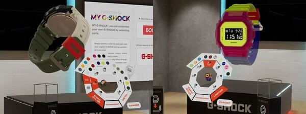 G-SHOCK商店虚拟世界将提供手表定制服务,允许用户通过不同的部件组合来打造个人专属G-SHOCK腕表,以及查看他们的VRChat头像戴着自己创建的手表的样子。此外,用户可以从全球创意项目在线市场BOOTH上的卡西欧官方在线商店购买手表部件,并将其作为数字物品用于VRChat,以创建虚拟G-SHOCK手表,供他们在G-SHOCK商店和其他VRChat世界的头像佩戴。这些虚拟手表可设置为用户所在位置的时间,使用户能够在VRChat中查看时间。