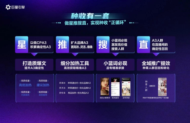 首先,针对“人群”,巨量引擎推出了“抢量CP”组合及“星推搜直”链路,助力商家实现极致种草,全面促收。
