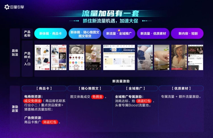 双11虽然不是流量的大促,但是要想赢得大促必须抓住流量。巨量引擎双11提前布局,推出了包括商品卡、随心推图文、短剧等在内的“新体裁、新流量和新内容”。