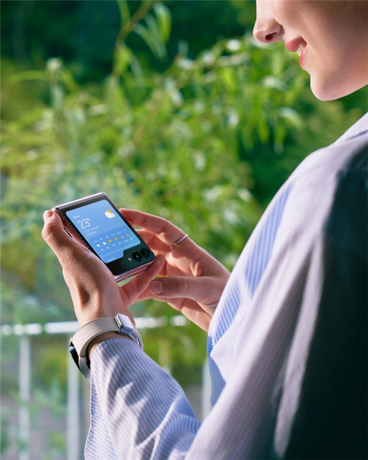 当处于折叠零度角,也就是完全闭合时,三星Galaxy Z Flip5只有一个粉饼盒般的大小,用户可以轻松单手握持使用或是将其收入衣兜、口袋,极致的便携性是直板手机无法比拟的。在这样小巧的闭合形态下,如果你觉着无法获得出色的功能性,那就大错特错了。三星Galaxy Z Flip5搭载了高达3.4英寸的超大外屏,很多以往只能展开手机在内屏启用的功能,现在都能在这块大视野智能外屏中实现。