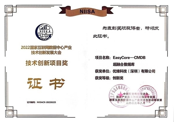 为进一步贯彻落实国家创新驱动发展战略,推进以科技创新为核心的全面创新,NIISA联盟于2023年3月20日发布“2022年度技术创新奖项申报工作的通知”,经过联盟专家委员会专家初审、项目答辩、专家评审、结果公示等系列工作,技术创新项目奖和技术创新人才奖项正式发布。经过激烈角逐,优维科技“EasyCore—CMDB超融合数据库”、“Hyperlnsight超融合持续观测解决方案”从众多项目中脱颖而出,荣获了”技术创新项目创新奖“,再次证明优维科技的科技创新实力,获得市场和行业的双重认可。