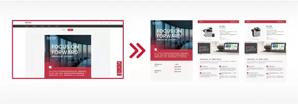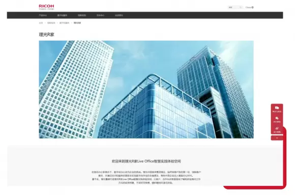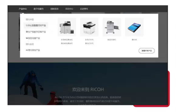 与视觉改进相呼应的,层次结构清晰的菜单栏与内容布局,展示了理光中国的公司规划、发展理念和主导产品。为了能让用户在1-2步操作中即可找到需要的内容,层次结构丰富、易操作的页面导航,有效减少了访问层级,可以协助精准触达。