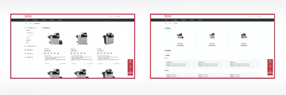 在用户查阅产品维度上,理光也根据大量的用户使用调研,为硬件产品重新设计了集合页,呈现了大幅产品图片与重要产品参数,强化了同类别产品在线规格对比。
