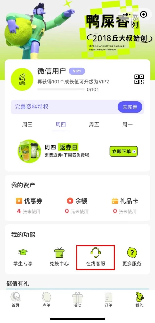 丘大叔注重线上线下全消费场景与差异化消费体验的打造。在线下,根据地方特色、空间形态的不同,打造“一店一风格”的多样主题店。在线上,则以“丘大叔柠檬茶”小程序为主阵地,打出一套集“会员体系、主题活动、企业团购、储值金”的运营组合拳,通过各种花式玩法增强用户粘性,提升用户的忠诚度。