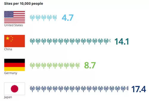 图:不同国家每10000人可用基站数量。