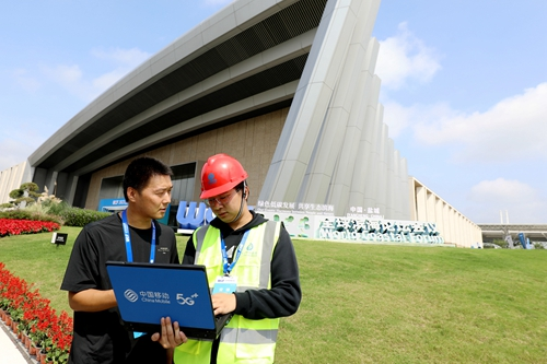 江苏移动盐城分公司从应急保障、网络质量、应用感知等多个关键维度出发,对活动相关会场、展区、交通枢纽等区域进行网络优化,保证相关区域4/5G网络100%优质覆盖,有效满足了会议主办方、参会人员及工作单位的网络同时在线需求,确保会议直播、现场连线等活动顺利进行。图为移动优化人员与会议工作人员进行网络巡查检测。