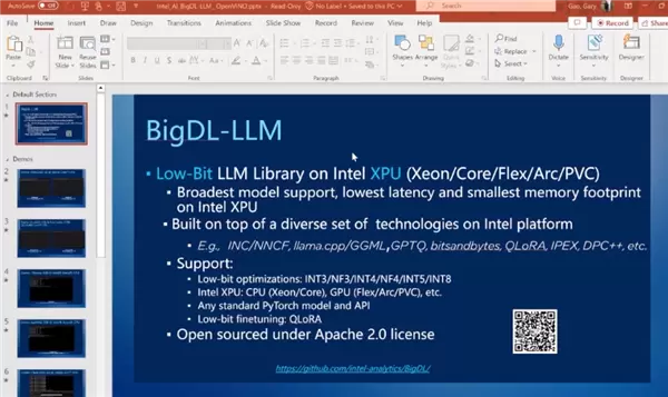 对于PC端侧运行AIGC应用的具体落地实现,高宇举了个例子,Intel正在打造的一个开源框架BigDL-LLM,专门针对Intel硬件的低比特量化设计,支持INT3、INT4、INT5、INT8等各种低比特数据精度,性能更好,内存占用更少。