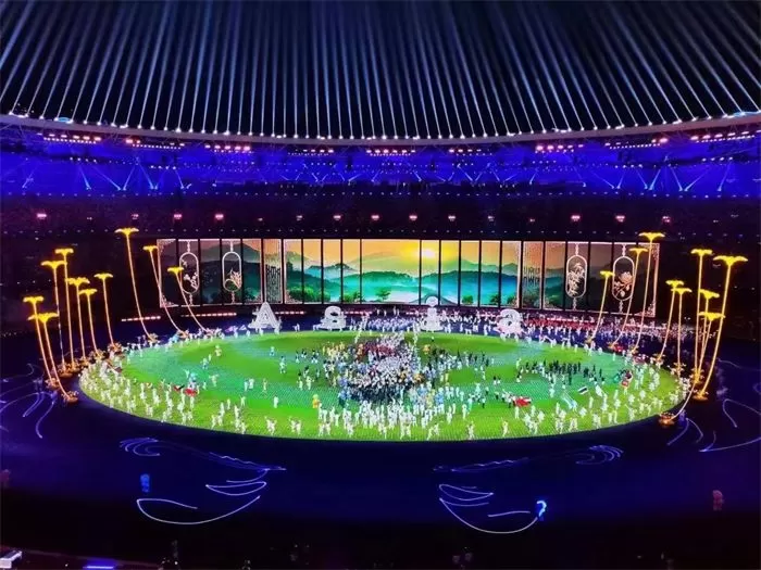 此次闭幕式上,中润光电技术团队运用先进的LED显示屏,再一次展示了动人的科技之美。6000平米的透明网慕屏,与亚运史上首创的数控草坪一起,巧妙配合勾勒出绚烂多变的影像,生动展现杭州绿水青山生态魅力,表达亚洲“山水相连、人文相亲”的历史情谊。