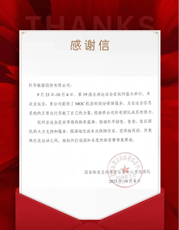 值得一提的是,本届亚运会的成功举办离不开强有力的亚运指挥中心(MOC)的支撑。据悉,该指挥中心使用了整整一层的38个科华机柜,打造了一个“最强大脑”,为比赛的顺利进行提供了有力的保障。