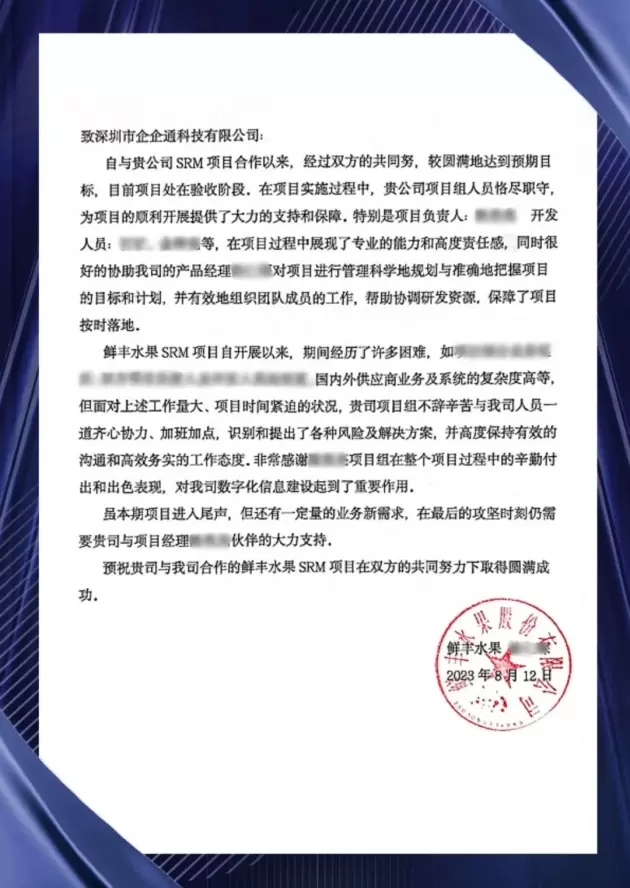 鲜丰水果项目顺利上线后,客户对企企通项目团队的努力付出作出了高度评价,并收到了来自鲜丰水果的感谢信: