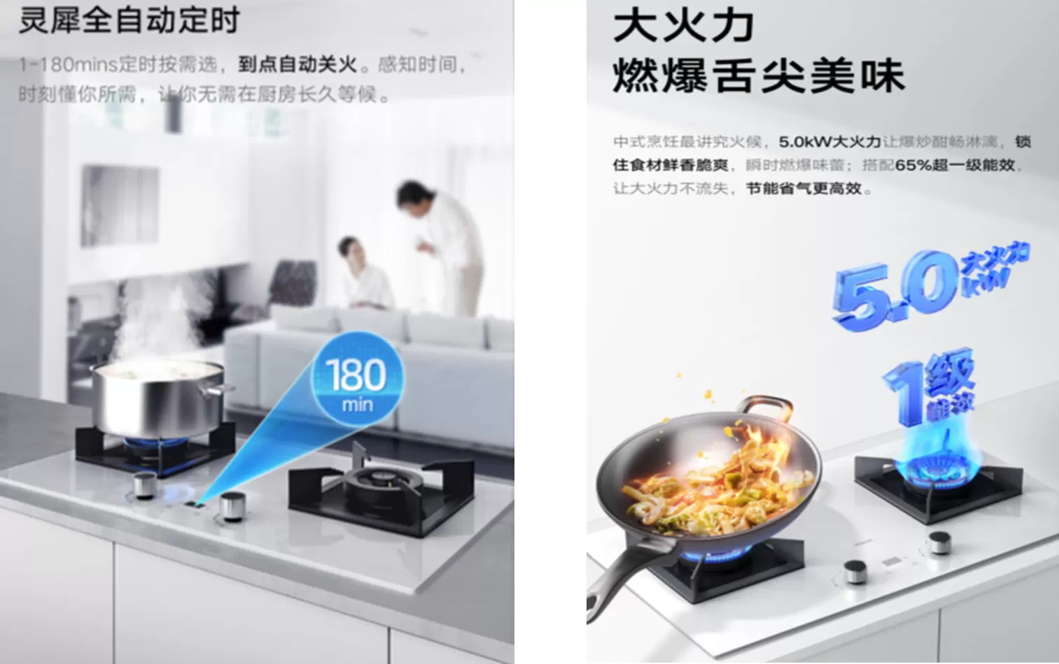 在灵犀全自动套系中,灵犀全自动燃气灶38B8XF(远山黑)/38B8XW(冰川白)也令人眼前一亮。这款产品搭载了全新灵犀全自动定时系统,从三分钟的快煮到三小时的慢炖都可轻松实现。消费者无需时刻在灶台前枯燥的等待,可以根据需要在1-180分钟内灵活设定时间,达到设定时间后,灶具会自动熄火,充分保障用火安全。此外,它还提供了5.0kW的超大火力,让爆炒变得更加轻松自如,瞬间锁住食材的鲜美口感。而65%的超一级能效则保证了在大火力烹饪的同时,能效利用率极高,有效节约能源和降低燃气消耗。
