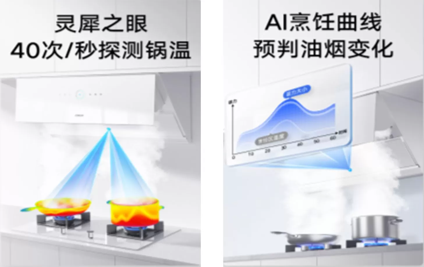 黑白双色灵犀全自动烟机套系的高颜值之下是强大的性能内核,其搭载的灵犀主动控烟系统2.0、“灵犀之眼”蜂频传感器以及灵犀全自动定时系统,让烟灶之间完美配合,使烹饪过程更加从容、舒适。其中,灵犀全自动烟机29X8S(远山黑)/29X8SW(冰川白)搭载了灵犀主动控烟系统2.0,能够主动探测锅区的温度,并根据油烟变化进行提前预判。这意味着,从开机到调档,再到关机,全程都不需要手动调节烟机,彻底改变了以往因为油烟而手忙脚乱的下厨状况,让消费者能够轻松应对油烟问题,享受更加从容、舒适的烹饪体验。而烟机的“主动”,离不开能感知温度的“灵犀之眼”——蜂频传感器,它能以40次/秒高频探测双灶区域的温度变化,结合老板AI烹饪曲线,精准预判不同的烹饪状态,实现自动开关机与调节烟机至合适档位,最后进行急速吸排。此外,灵犀烟机采用了创新的侧吸三面拢式设计,结合25m³/min的超大吸力和1100Pa的最大风压,实现了出色的吸排效果。即使在爆炒辣椒的情况下,消费者也不会感到烟味呛人,保证了厨房的空气质量。