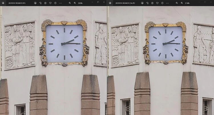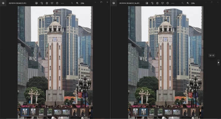 放大后可以看到,不管是中心的分辨率,还是边缘像差,能察觉到画质明显受到了矫正,按照官方说法,这一工具“降噪功能基于高效的降噪处理,提升轮廓线的品质和降噪效果。去马赛克功能可砸种莆鄙省⒛Χ埔约熬獬菹窒螅嵘枷穹直媪Α>低酚呕窃惺刖低酚呕δ艿纳栋妫郧埃蠓南癫钜约跋癫钜鸬母吖庖绯鍪呛苣巡钩サ模舜蔚木低酚呕母纳菩Ч辛撕艽筇嵘!�