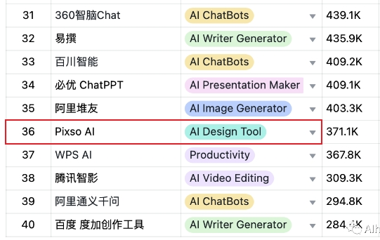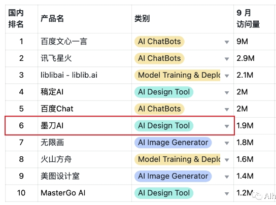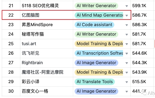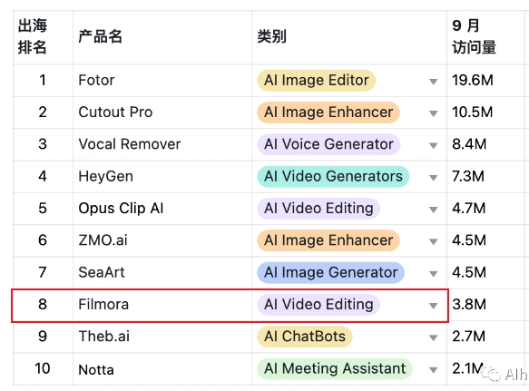 据了解,该榜单筛选分析了5000+ AI全球产品(web),覆盖了从访问量、时长、增长速度到营收等关键数据,涵盖了100个AI细分领域,并进一步将产品拆分为海外市场、国内市场、国内出海三个维度进行分析,为投资者和行业从业人员提供了趋势参考。