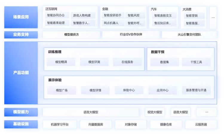 目前,火山引擎大模型服务平台——火山方舟上已入驻智谱AI、 Minimax、字节跳动云雀等多家AI科技公司及科研院所的大模型,Moonshot AI的大模型服务Kimi Chat也将登陆火山方舟。火山引擎将持续联合国内优秀的大模型服务商,提供模型训练、推理、评测、精调等全方位功能与服务,助力千行百业加速AI进程。欢迎各位企业在方舟中体验大模型, 火山方舟愿与大家的业务共同成长!