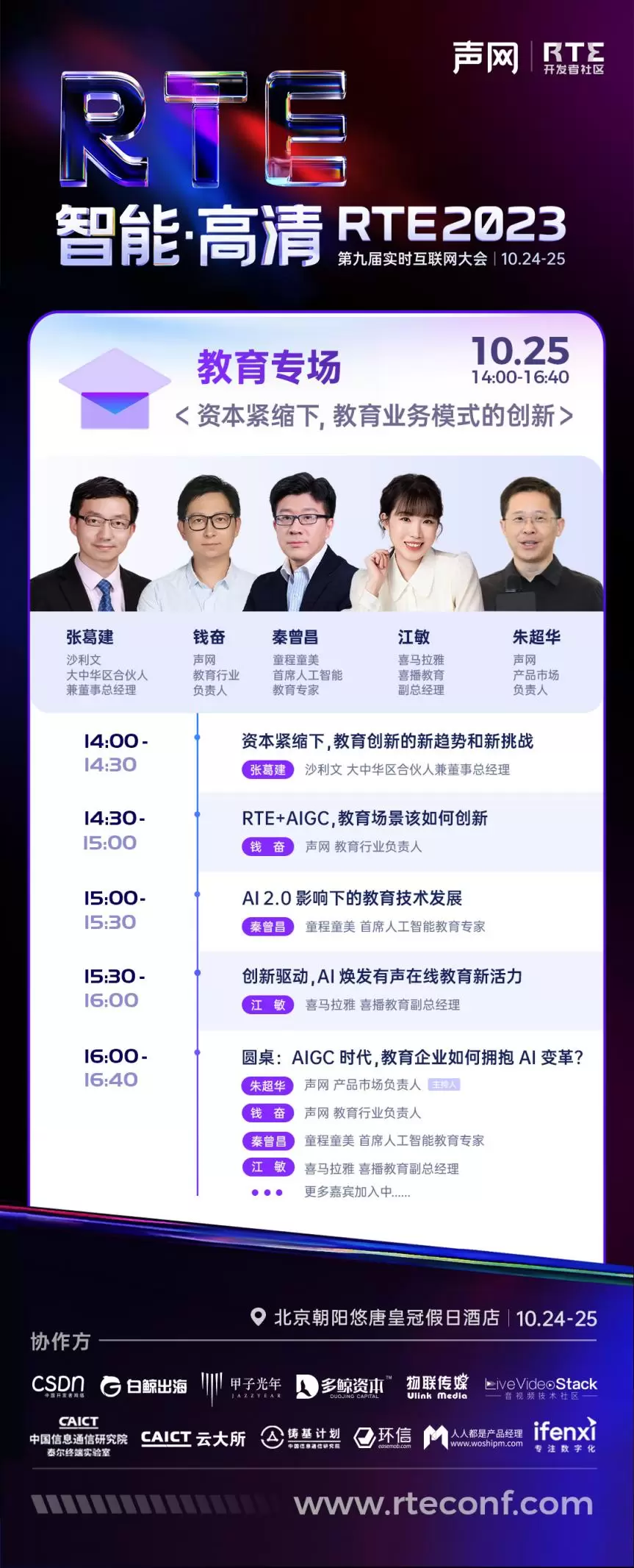 10 月 25 日 14:00 ,声网和多鲸联合举办主题为《资本紧缩下,教育业务模式的创新》论坛,邀请到了沙利文大中华区合伙人兼董事总经理张葛建、声网教育行业负人钱奋、童程童美首席人工智能教育专家秦曾昌、喜马拉雅喜播教育副总经理江敏、声网产品市场负责人朱超华等来自于职业教育、素质教育等各赛道教育企业的行业专家、创业精英,探索新路,同台交流。