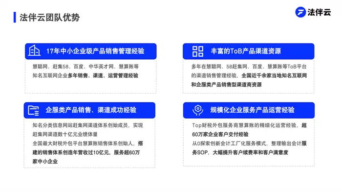法伴云的创始团队在企业服务营销、交付、加盟商扶持上拥有着丰富的实战操盘经验。在营销方面,团队成员均来自于京东、百度、58赶集、慧算账、慧聪网等TO B类平台,拥有丰富的营销及运营经验;在交付上,团队成员拥有规模化的企业服务产品交付经验,为超过60万家企业客户交付,他们建立了完善的服务交付和管理体系,确保交付质量;在代理商扶持上,团队拥有全国近千家当地知名互联网和企服类产品销售型渠道商资源,能快速形成规划和品牌效应,帮助加盟商快速熟悉市场、制定营销策略、提高业务水平,为代理商提供了全方位的支持和帮助。
