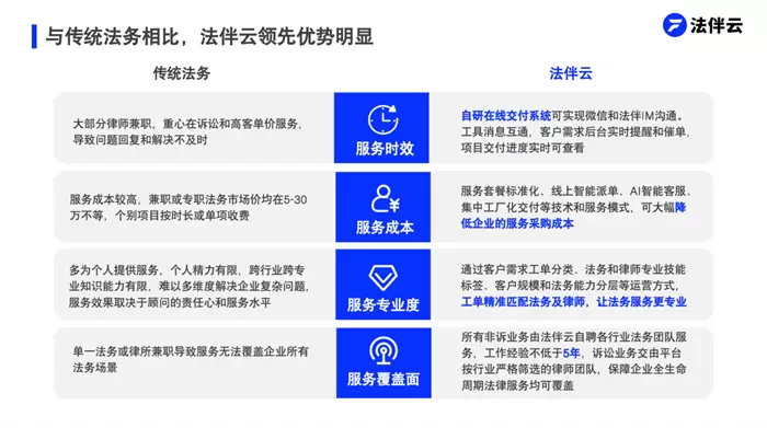 尤其是法伴云的创始人刘辉,拥有17年互联网TOB产品销售管理及运营经验,曾是top财税外包服务商慧算账营销体系的创始人,多次操盘超10亿元年营收规模的销售体系,极具丰富的tob销售和服务交付体系搭建经验。基于这些背景和经验,使得法伴云对中小企业需求有了深刻的理解,能够精准满足其法律服务需求,助力企业合规经营。