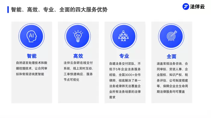在法律服务行业,法伴云给出了自己的答案。作为国内领先的企业AI数智化法务共享平台,法伴云将最前沿的科技与法律服务深度融合,为广大企业提供智能、高效、专业、全面的法律服务,不同于其他法律服务平台以解决发生问题为主,事后补救,治标不治本,法伴云在解决问题的同时,还会从根源形成事前排查、事中管控、事后补救的全流程风控系统,为企业提供全方位的法律支持和保驾护航,帮助企业应对复杂的法律事务,降低风险损失,并确保企业合规和稳步前进。正是依托其深厚的团队实力、强大的技术实力、完善的交付实力,让法伴云在一众法律服务平台中脱颖而出。