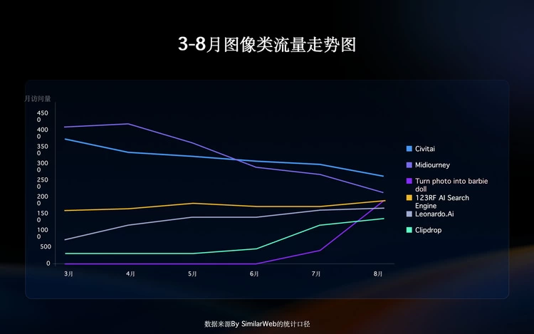 这一趋势可以从数据上明显看出,例如 Midjourney作为尝鲜用户的首选,其数据量开始呈现下滑趋势,而像 Adobe系列这样偏专业向的产品,用户规模则在稳步提升。