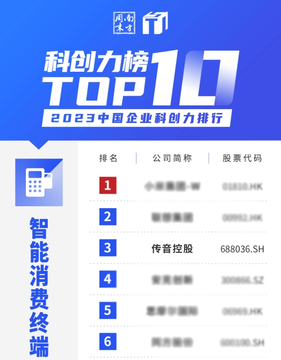 传音控股位列“2023中国企业科创力排行”智能消费终端行业前三