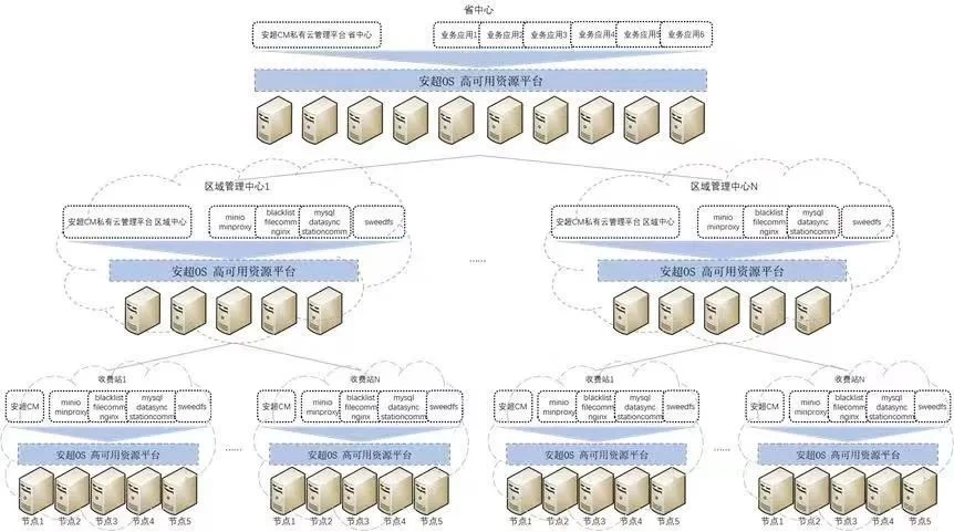 在每个收费站、区域管理中心及省中心内部署ArcherOS超融合平台和ArcherCM云管理平台,为业务应用提供计算、网络和存储等资源,同时为区域管理中心和省中心提供纳管数据。按照省中心、区域管理中心和收费站三层组织架构实现统一纳管和运维。