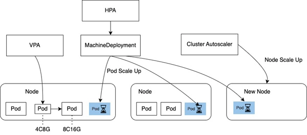 与离线任务相比,在线业务具有明显的波峰波谷,可利用潮汐调度来实现资源的优化配置。利用K8s的VPA(Vertical Pod Autoscaler)、HPA(Horizontal Pod Autoscaler)组件,可在低峰和高峰时分别为工作负载进行缩容和扩容。同时利用K8s的CA调度器(Cluster Autoscaler)实现基于pod的扩缩,而在集群容量不足时扩容新的node节点。(如下图)
