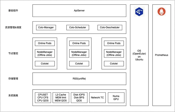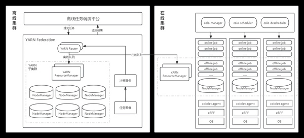 知乎大数据场景低优离线任务调度至在线集群后,在线集群中在离线业务的混部通过Colo管理与调度,Colo通过调度与重调度能力、CPU/Memory/BLKIO/网络带宽等资源隔离及资源动态调整压制、资源冲突检测与处理、实际负载感知调度能力、eBPF关键内核指标的采集和利用等关键技术,保证了在离线混部节点间均衡调度、节点不过载、在线服务稳定性、敏感型业务不受干扰、离线资源及时回收等问题。Colo通过Colo-manager、Colo-scheduler、Colo-Descheduler、cololet等组件,采取削峰填谷的方式,提高在线集群资源利用率,降低离线集群在夜间的超负荷运转状况,实现服务器资源利用率大幅提升,从而减少了企业IT开支。(Colo架构如下图)