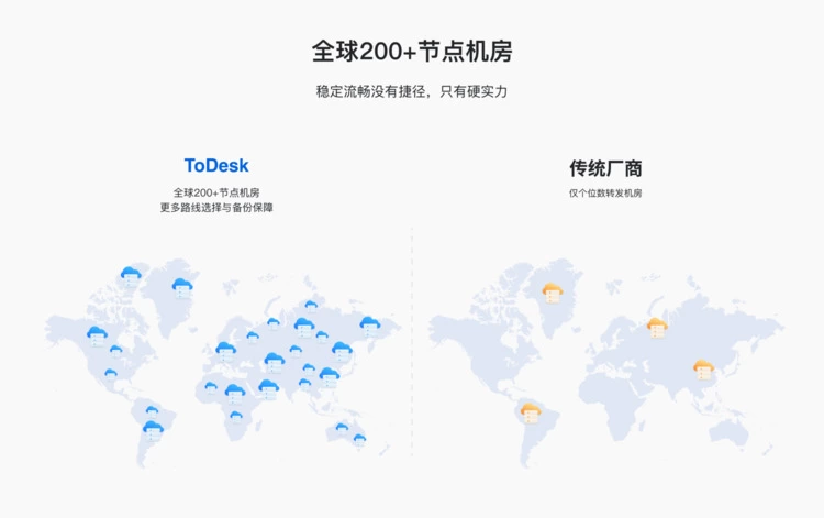 同时搭配全球200+的节点机房,以高覆盖密度的优势提供更多可用且稳定的线路,通过选出最佳接入节点和最佳转发路线,实现全球范围内低延时、无卡顿的远程控制。