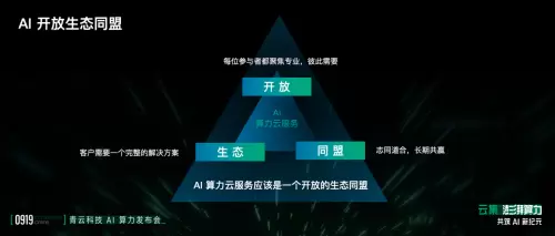 “我们有一个大胆的设想,在AI领域一定会出现巨头,但这个巨头不应该是一家独立的公司,它应该是一个小的生态,因为要做的事情真的太多了。因此,青云AI算力云服务的定位是一个开放的生态同盟。青云集结这些志同道合的合作伙伴,通过同盟的方式一起运营AI算力云服务。”他强调,在AI算力云当中,“首先,客户需要完整的解决方案,所以生态是必须的。第二,每位参与者都是专业的、彼此需要的,所以彼此之间应该要开放。第三,大家是志同道合、长期共赢的同盟。”
