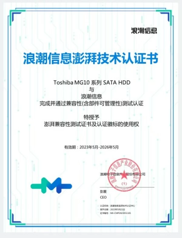 东芝MG10系列企业级SATA HDD获得浪潮信息澎湃技术兼容性认证