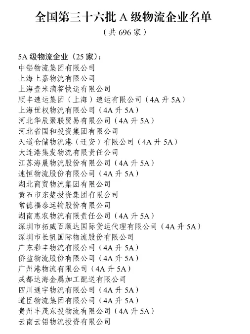 本次评审,中铝物流集团有限公司、上海上嘉物流有限公司、顺丰速运集团(上海)速运有限公司等25家企业成功跻身全国第三十六批5A级物流企业之列。据了解,这些企业中不乏第一次参加A级物流企业评选且第一次申报就斩获5A的物流企业,其中,上海上嘉物流有限公司可以称作典型。