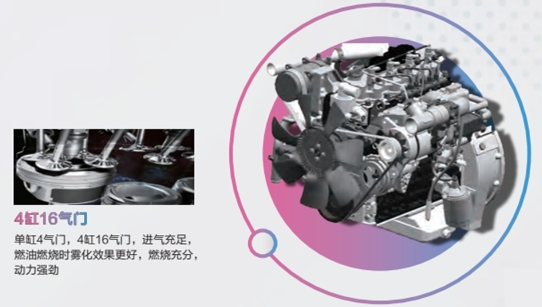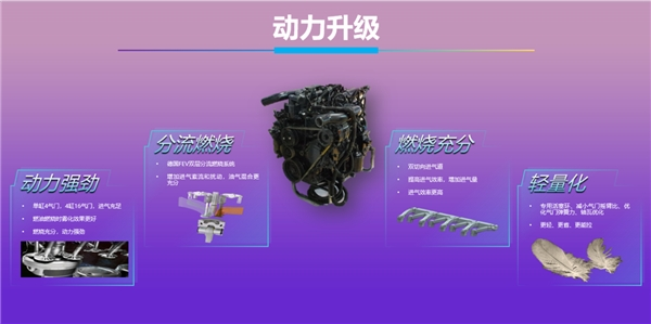 该发动机采用德国FEV双层分流燃烧系统,燃油雾化效果更好。搭配双切向进气道,进气效率更高,燃烧更充分,动力强劲,经济省油。活塞环、气门弹簧、轴瓦等零部件全部优化,更轻、更省、更能拉。