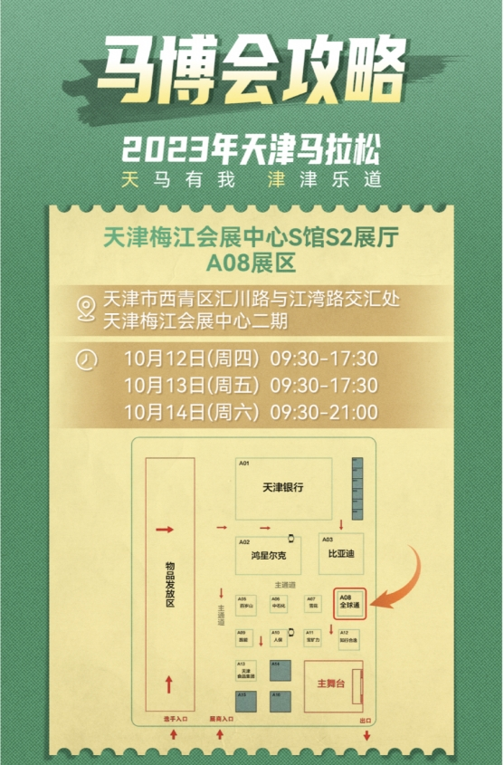 赛前阶段,中国移动在2023年天津马拉松博览会现场设置了“全球通·逐马计划”展台,全球通参赛选手可以在10月12到14日期间到场领取包括运动背心、定制束口包、运动T恤在内的品牌专属定制装备礼包。马博会现场还将携手全国半程马拉松纪录保持者彭建华等嘉宾举办分享会,向跑友们介绍天津文化及赛道情况,交流科学备赛经验、分享城市跑者故事,助力跑者做好赛前“热身”。