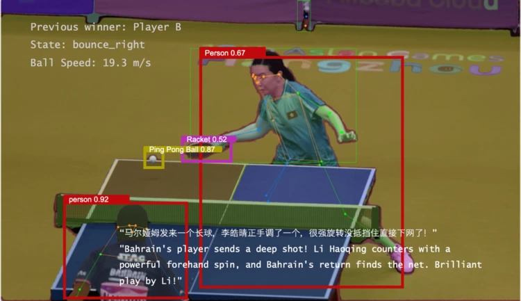 基于多模态大模型,在北京大学计算机学院黄铁军教授及仉尚航研究员的指导下,团队还为本次亚运会研发了一款智能AI赛事解说系统。黄铁军教授提出了「脉冲连续摄影原理」,直接用每个像素的定额积分时间表达光强,相机速度取决于电路能够实现的最短信号读取时间,颠覆了持续近两个世纪的定时曝光成像原理,解决了传统相机不能兼顾超高速、高动态的问题,被中国电子学会鉴定认为是「超高速成像和机器视觉领域的重大原始创新,超高速成像技术达到国际领先水平」。有了高速脉冲相机,就能够同时实现超高速、高动态、全画幅连续成像。在此基础上,团队通过自研的 X-Accessory一体化大模型工具链,设计了多模态多语种视频解说系统,在亚运会期间用于乒乓球、跆拳道、跳水、体操等赛事。这个解说系统的特点在于,它不仅能够理解和分析正在进行的比赛,生成实时的解说内容,还可以根据观众的喜好提供个性化的解说服务,包括将解说内容翻译成多种语言,包括维吾尔语、阿拉伯语等,从而为全球各地的观众提供丰富的观赛体验。