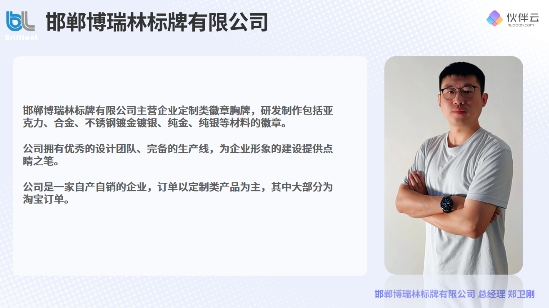 小小的徽章胸牌里,竟然门道不少。如何打破传统的人工管理模式造成生产进度不透明、订单管理混乱等弊端?邯郸博瑞林标牌有限公司总经理郑卫刚使用伙伴云搭建订单管理系统,实现了从下单—生产—发货的全流程闭环,整个生产进度更加公开透明,也大大提升了订单管理效率。 近日,伙伴云邀请郑总做客《小伙开麦》直播间,与观众分享了他对企业数字化转型、零代码系统搭建和使用的感受和心得,一起看看吧!
