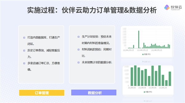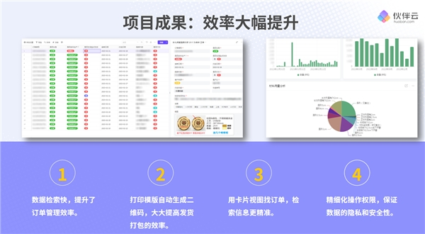 通过伙伴云零代码,郑总自主搭建了订单管理平台,打造了内部数据库,打通生产闭环。包括——