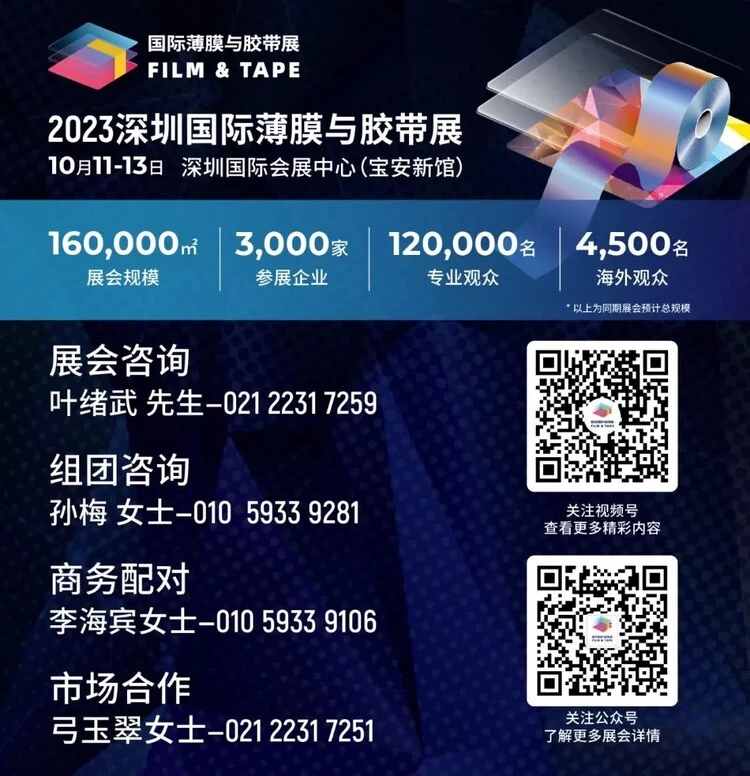 10月11日,2023深圳国际薄膜与胶带展(FILM & TAPE EXPO 2023)在深圳国际会展中心拉开帷幕,本届展会规模再创新高,连同同期展会展出面积达160,000㎡。