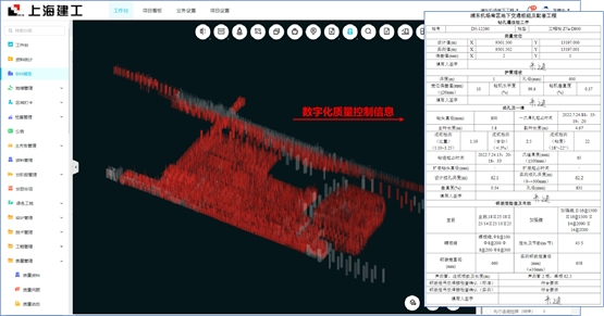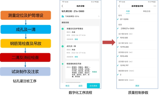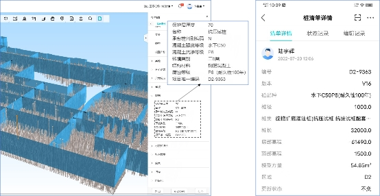针对本项目在桩基围护阶段近2万根灌注桩、1000幅地下连续墙带来的工序验收繁杂、过程资料难整理等问题,项目部自主研发标准化施工工序管理系统,实时采集并记录施工过程中的质量控制参数。现场管理人员根据工序验收节点实时将现场各类验收信息,通过平台内工程BIM模型所匹配的位置上传,平台统一整合并汇总,形成工程数字化模型。