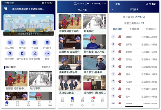 项目积极响应总承包部智慧云教育平台,确立“人人都是安全员”的安全意识,全员参与线上安全教育,提升务工人员安全防护意识和自救能力,累计积分75000余分,工人凭积分可在机场建设者小镇兑换消费券。