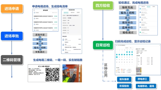 以电箱管理为例:项目规范临时用电各环节,实现电箱线上的进场审批、四方验收、二维码巡检、报失报修等功能,形成链路式的“一箱一码”临电管理体系。做到临电调整、验收高效率,日常维护、维修管理动态化,设备信息可实时追溯,确保临电管理各环节标准化,提升项目安全管理成效。