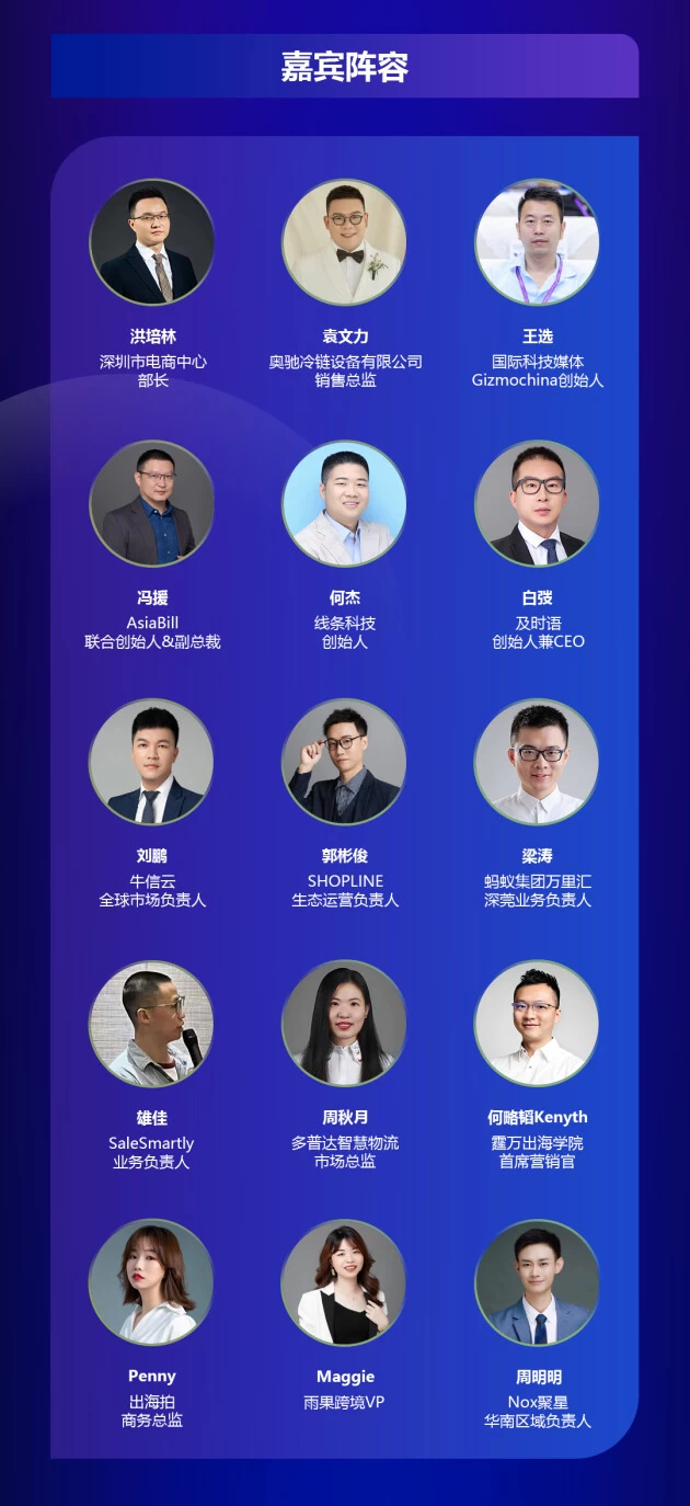 除跨境卖家实战经验分享,本次活动还邀请到AsiaBill联合创始人&副总裁冯援、线条科技创始人何杰、及时语创始人兼CEO白弢、牛信云全球市场负责人刘鹏、蚂蚁集团万里汇深莞业务负责人梁涛、SaleSmartly业务负责人雄佳、多普达智慧物流市场总监周秋月、霆万出海学院首席营销官何略韬、SHOPLINE生态运营负责人郭彬俊、出海拍商务总监Penny、雨果跨境VP Maggie、Nox聚星华南区域负责人周明明等多位行业专家亲临现场助阵,答疑解惑。