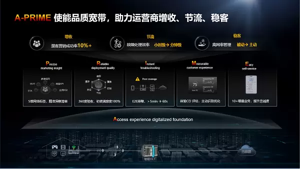 随着经济生产力发展不断带动消费者需求升级,体验至上的趋势正掀起家宽领域的新浪潮。如今,品质体验已被视作产品与服务之外的独立价值载体,是家宽领域业务发展的重要衡量指标。岳伟提到,在运营商探索家宽体验提升的过程中,有“三座大山”亟待跨越。首先,营销成功率低,在中国,每千人电话外呼仅有16个转化,营销成本高企。其次,海量的用户投诉中,70%需要上门解决,运维成本高。第三,存量市场竞争激烈,离网率高。而究其根本,上述挑战来源有三,第一,使用Wi-Fi连接的终端爆发式增长,家庭网络复杂程度日益累积。第二,在线办公、游戏等实时交互类视频应用对网络质量极其敏感。再者,家宽体验问题所涉因素超过50个,因其动态变化,定位复杂。针对上述发展困局,华为品质宽带解决方案,以全新的“A-PRIME”价值主张为运营商赋能。其以接入体验数字化底座(Access experience digitalized foundation)为基础,提供精准营销洞察(Precise marketing insight)、高质量部署(Reliable deployment quality)、极速故障处理(Instant troubleshooting)、用户体验可度量(Measurable customer experience)、极简自助服务(Easy self-service)的五大维度价值赋能,驱动达成品质体验经营。