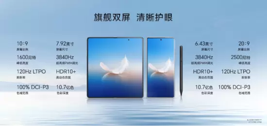 荣耀MagicVs2外屏搭载6.43英寸OLED 屏幕,采用20:9比例,分辨率2376 x 1060,能实现2500nit的峰值亮度;内部展开则是7.92英寸的OLED屏幕,采用9.78:9比例,分辨率2344 x 2156,能实现1600nit的峰值亮度。极高亮度设计和内、外双LTPO屏幕,不仅可以满足用户户外的清晰查阅,也可以在静态画面以更低的刷新率实现更为节能的效果。