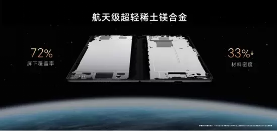 荣耀在折叠屏轻薄方面持续进行技术深耕,荣耀Magic Vs2机身重量最轻仅为229克,再次刷新大屏内折手机的轻薄纪录。屏幕支撑架构采用航天级稀土镁合金材料,材料密度降低33%,屏下覆盖率达到72%。