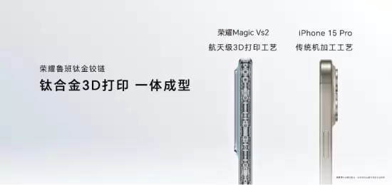 在折叠屏产品关键器件铰链方面,荣耀MagicVs2采用由钛合金3D打印技术制成的荣耀鲁班钛金铰链,带来轻薄与坚固兼具的使用体验。铰链0齿轮结构和悬浮水滴结构的应用也让荣耀Magic Vs2开合顺滑,且支持多角度自由悬停。在轻量化更进一步的同时,荣耀Magic Vs2也做到了5.1mm的展开态厚度、10.7mm的折叠态厚度,在同类折叠屏手机当中继续保持领先水平。