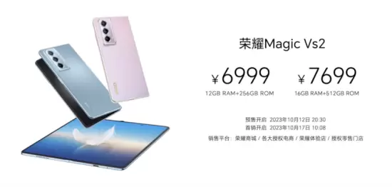 荣耀Magic Vs2提供冰川蓝、珊瑚紫、绒黑色三种配色,存储方面提供12GB+256GB和16GB+512GB两个版本,售价分别为6999元和7699元。荣耀Magic Vs2系列将在2023年10月12日20:30开启预售,并在2023年10月17日10:08起在荣耀商城、各大授权电商、荣耀体验店、授权零售门店正式开售。