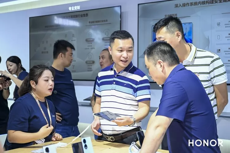 行业解决方案区则重点分享了荣耀基于多场景的业务需求,面向政企客户所提供的专业定制、安全隔离、加密通信、智能管控等多个专属服务和一体化解决方案;此外,荣耀还特别开设了HONOR Talents展区,展出多幅HONOR Talents荣耀全球设计大赛优秀获奖作品,到场观众可现场感受科技与艺术结合的创新之美。