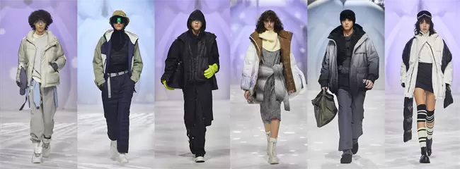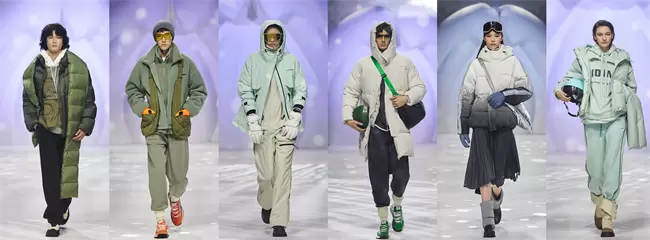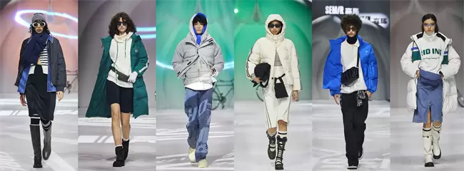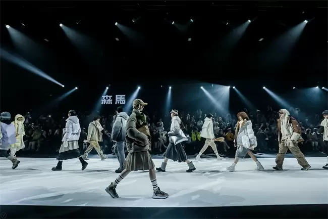 在变幻莫测的时光空洞中,舞台被打造成一个巨大的时空隧道,模特以动感活力的造型开场,骑行穿梭时空,经典重塑,演绎森马与国民品牌上海永久联名系列羽绒。